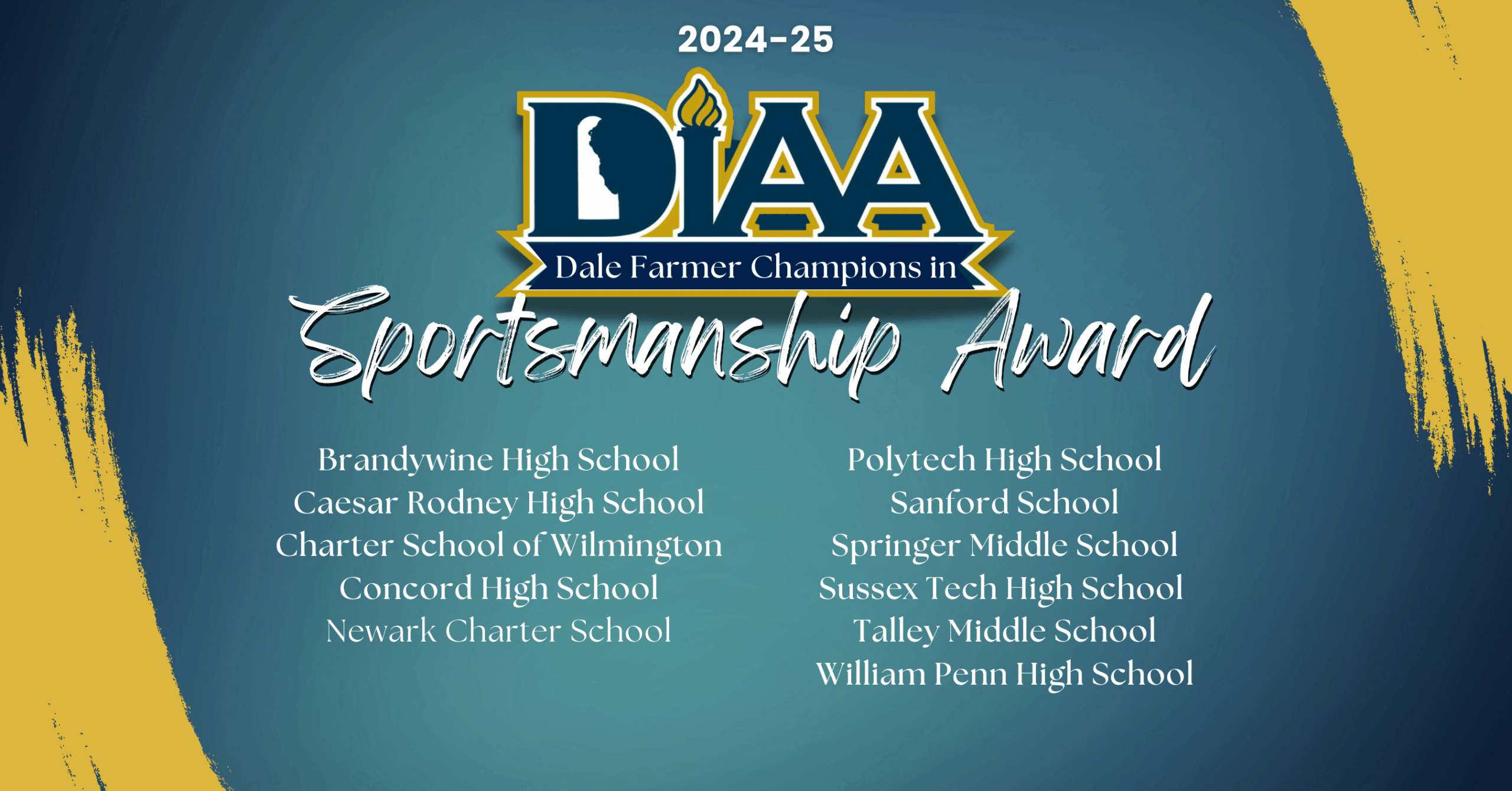 Dover, DE (September 5, 2025) Twelve (12) Delaware schools are being honored for sportsmanship by the Delaware Interscholastic Athletic Association (DIAA). The Dale Farmer State Champions in Sportsmanship Award is presented annually to schools that have demonstrated a strong school community commitment to the educational nature of interscholastic athletics.