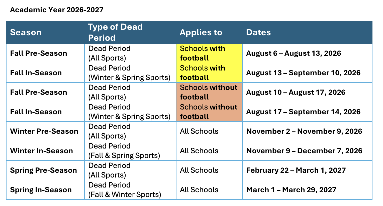 - FALL IN-SEASON DEAD PERIOD – For football schools – The dead period is from August 13 to September 10 for Winter and Spring Sports.